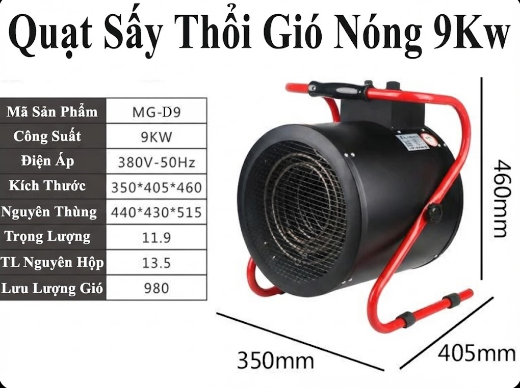 Máy sấy công nghiệp công suất lớn 9000W, sử dụng điện 3 pha 380V, hoạt động ổn định, bền bỉ. Thiết bị chuyên dụng trong các lò sấy nông sản, thủy sản, thực phẩm, ngành công nghiệp sơn và chăn nuôi.